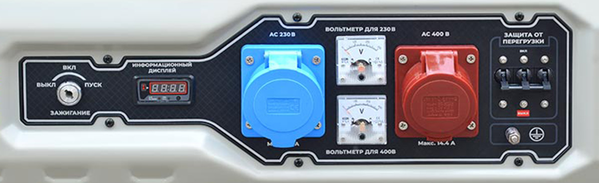 - Розетки: 230 В на 32 А 1 шт., 1 розетка 400 В на 32 А 1 шт., силовые клеммы для подключения мощных однофазных и трехфазных потребителей, что позволяет подключать разные электроинструменты